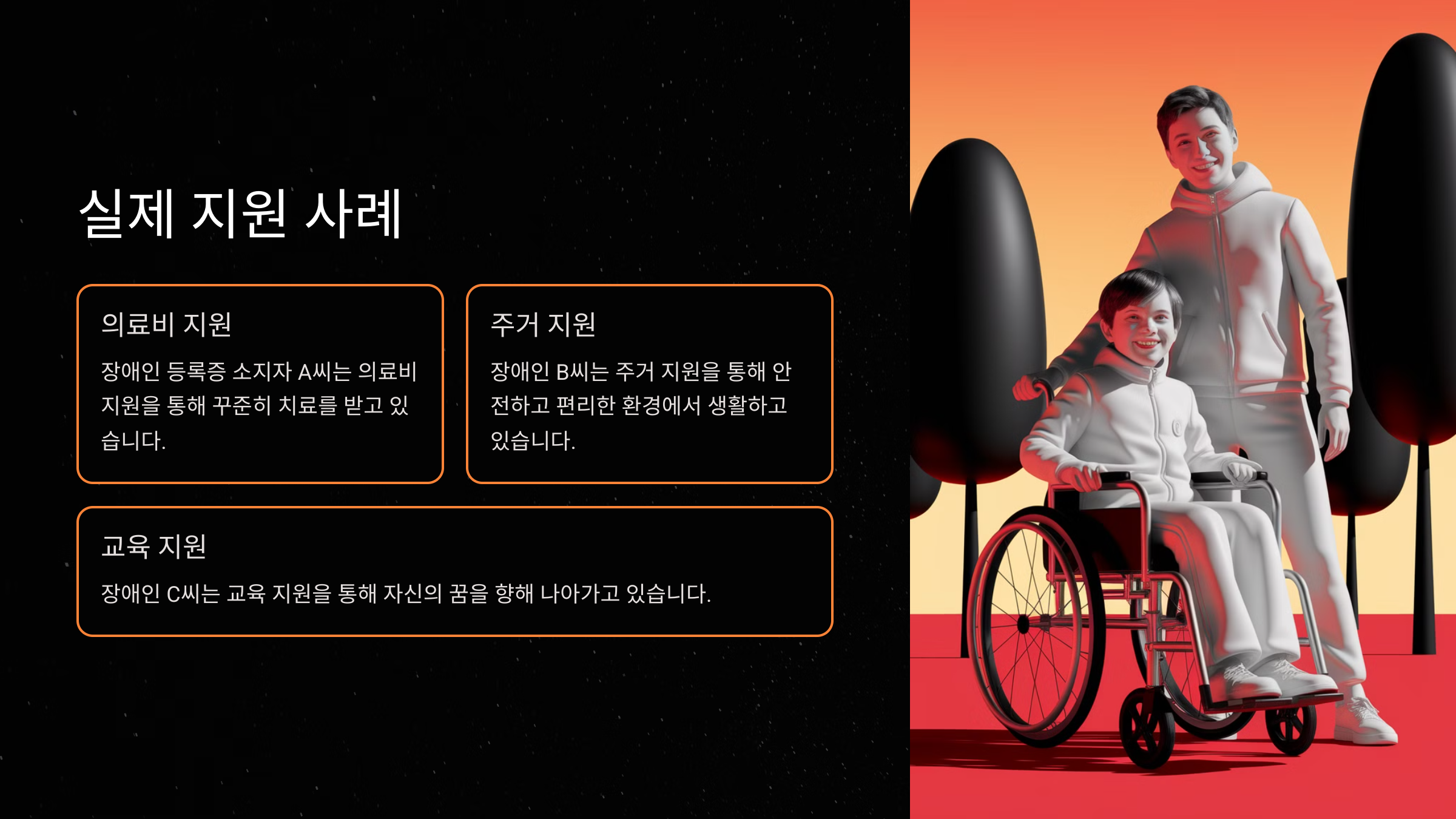 - 장애인 의료비 지원: 장애인 본인 부담금을 경감하여 치료비 부담을 줄여줘요.