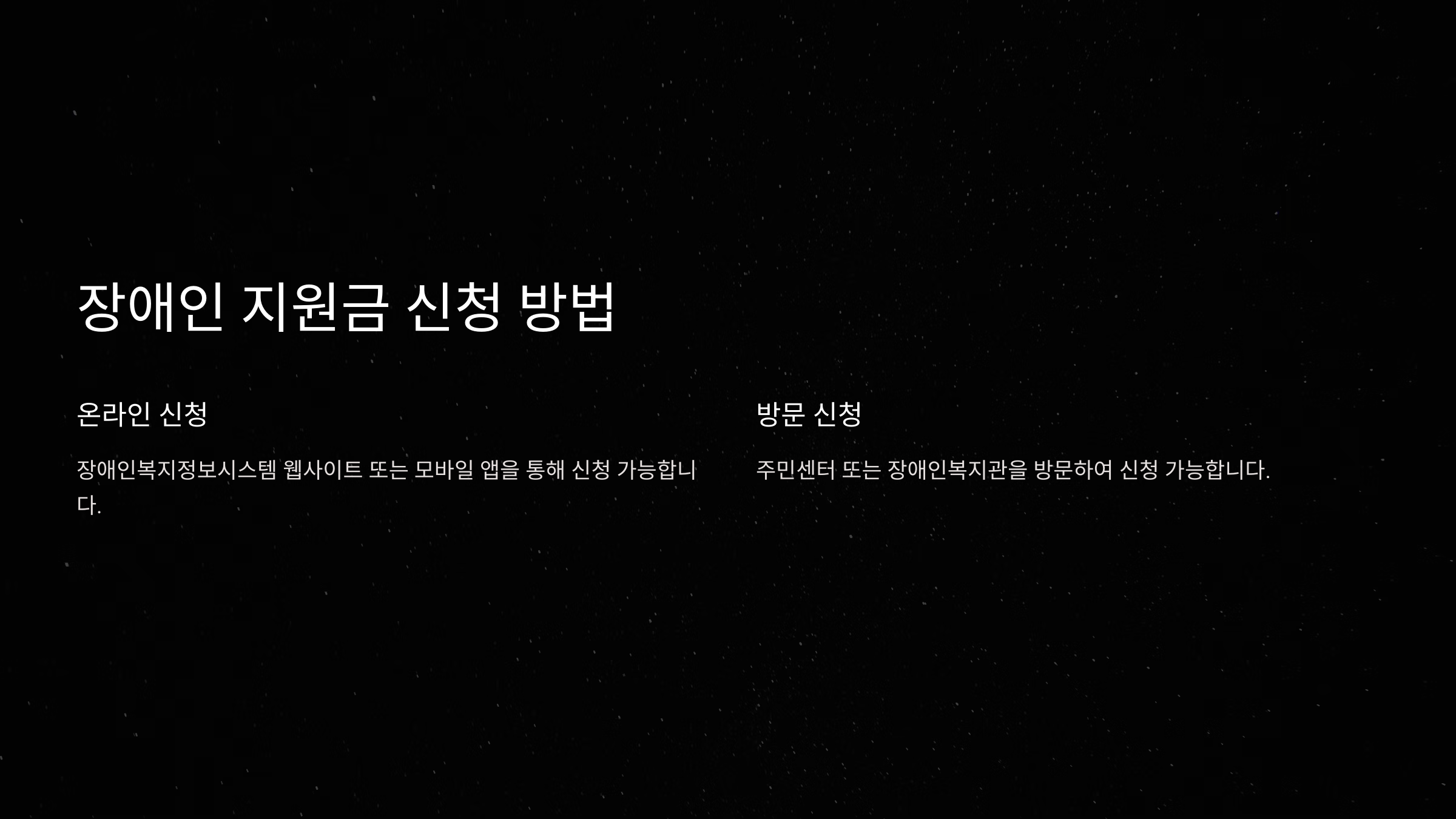 - 장애인 등록증, 소득 증빙 서류, 신청서 제출