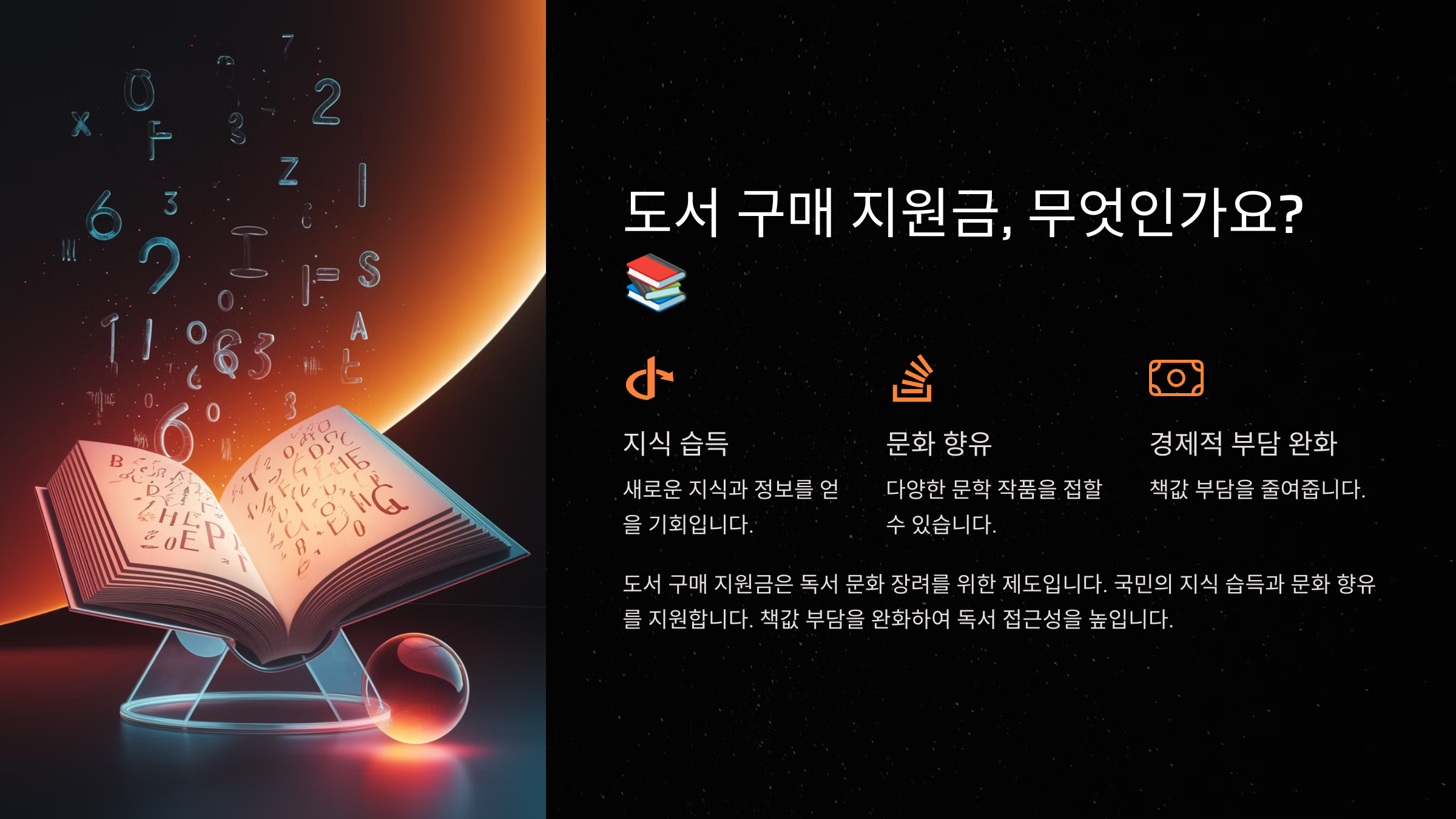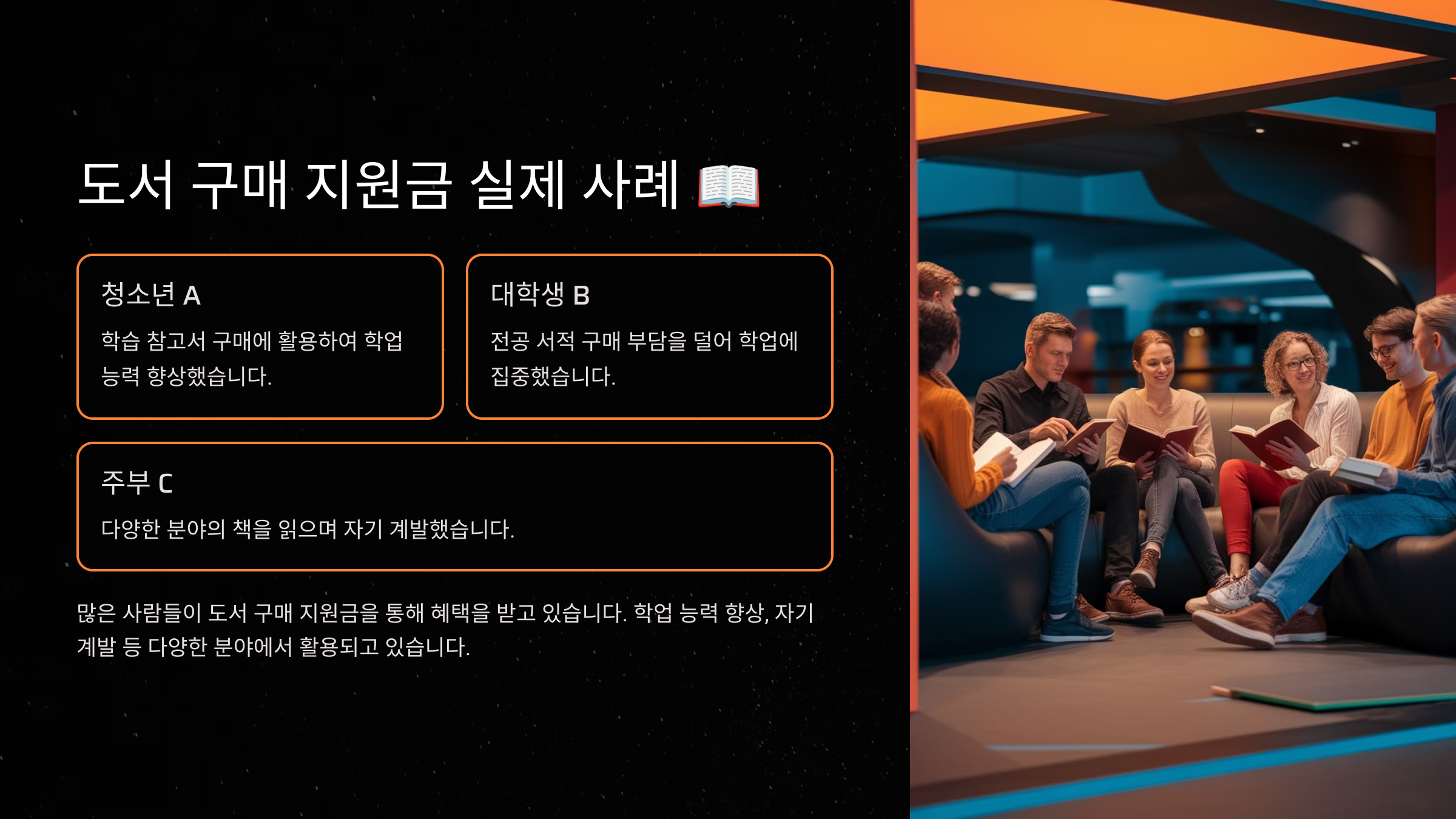 일반 서적, 전자책, 오디오북 구매 등에 사용할 수 있으며, 2025년부터 지원 대상과 금액이 확대되었어요! 🎉