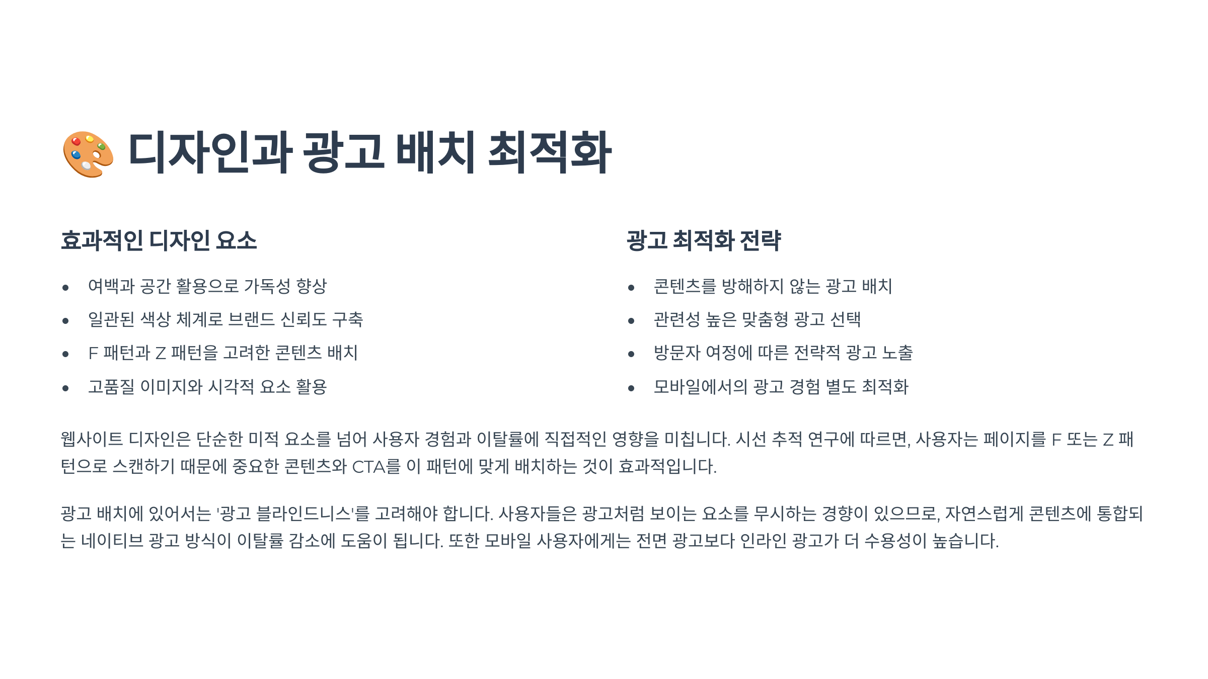 광고 배치도 사용자 흐름에 맞춰 자연스럽게 이어져야 해요. 갑자기 튀어나오는 팝업 광고는 이탈의 주범이에요.