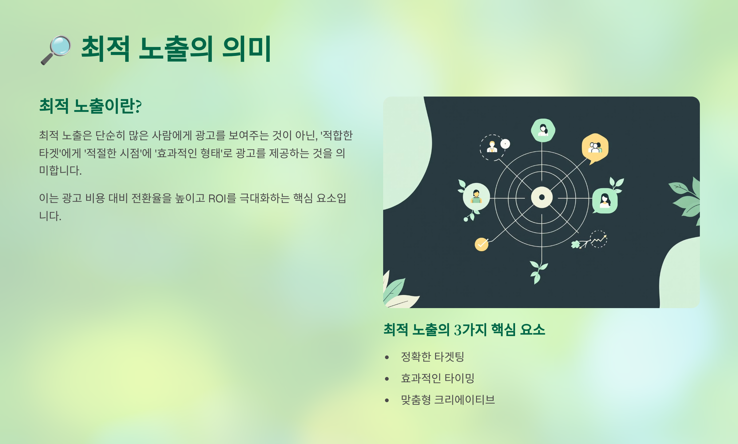 “최적 노출”이란 단순히 광고를 많이 붙이거나, 눈에 띄게 배치하는 게 아니에요! 2025년에는 광고 위치, 개수, 타입, 반응형/고정형 조합, 그리고 사용자 이탈률·스크롤 패턴까지 모두 고려해야 진짜 ‘최적화’가 돼요.