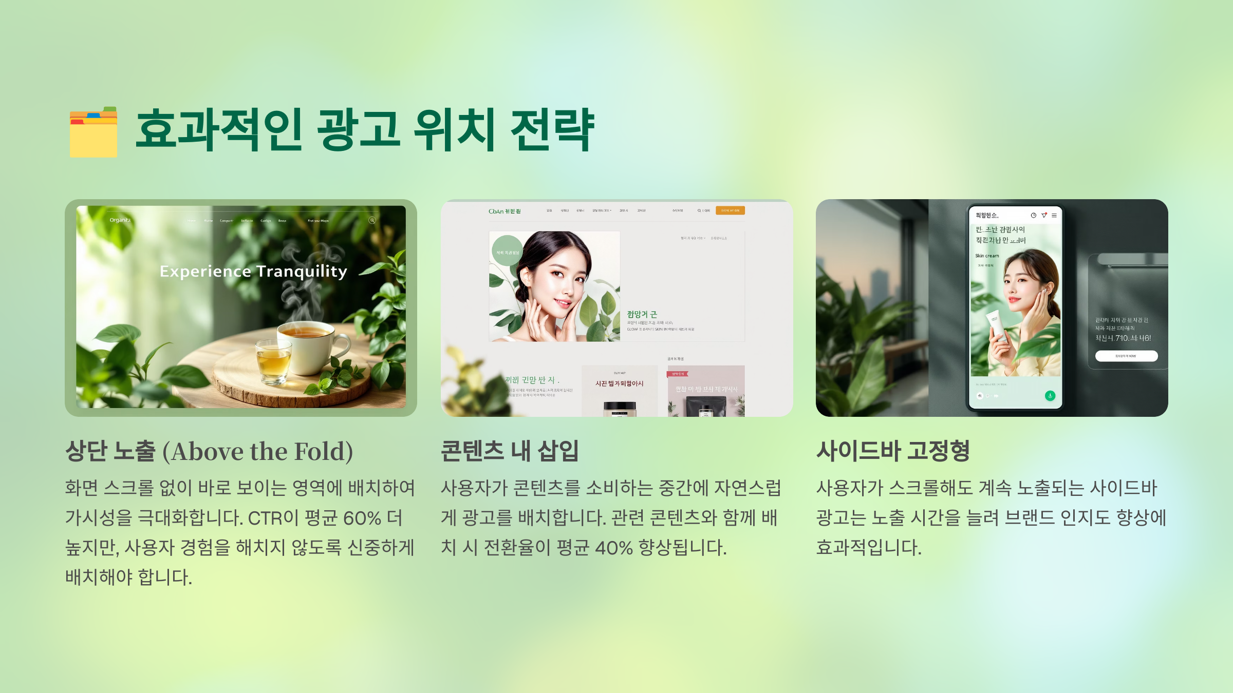 | 분산배치 | 상단·중간·하단·사이드바 분산 | 구간별 1~2개 배치 |